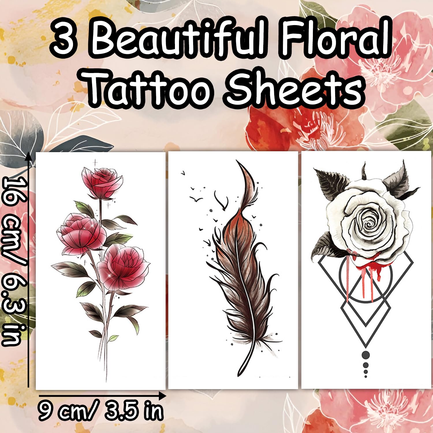 S.A.V.I 3 Pcs Large Temporary Tattoo Sheets for Women – Floral Rose, Feather & Geometric Designs | 16x9 cm Waterproof, Safe & Non-Toxic Body Art Stickers for Arm, Neck, Back – Easy to Apply & Remove (01)